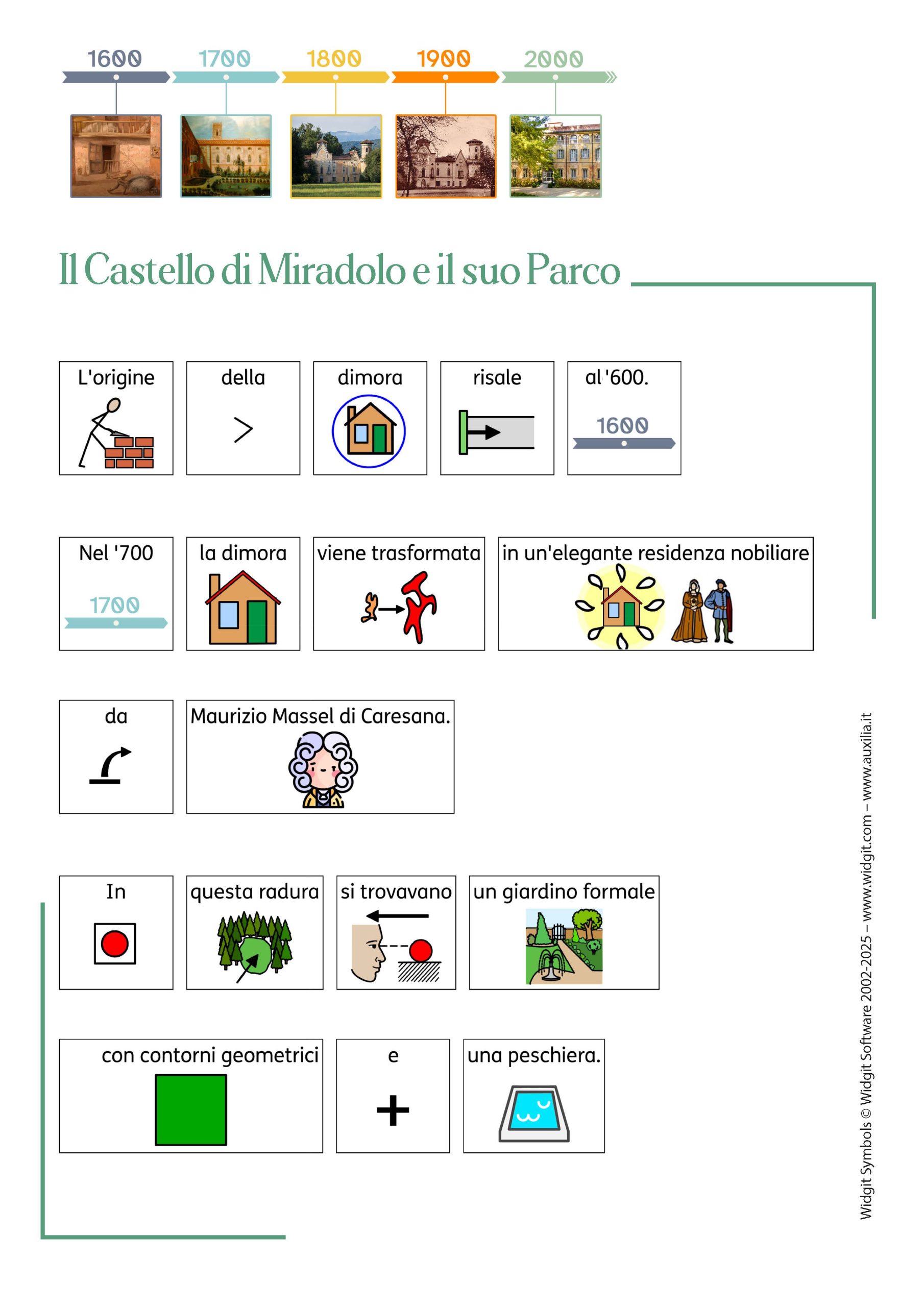 Nella seconda metà del Settecento, Maurizio Massel di Caresana trasforma l’antica “cassina” di Miradolo in un’elegante residenza nobiliare. In questa radura, come suggeriva la moda dell’epoca, si trovavano un giardino formale o “all’italiana” e una peschiera; l’antico ingresso principale, come si osserva dalle planimetrie ritrovate nel Fondo archivistico del Castello, attraversava le aiuole regolari e geometriche e collegava l’antico viale di tassi, che ancora oggi segna i confini del Parco lungo via Della Ressia, e l’originario accesso alla Dimora, che mostra tuttora tracce dello stemma della casata.