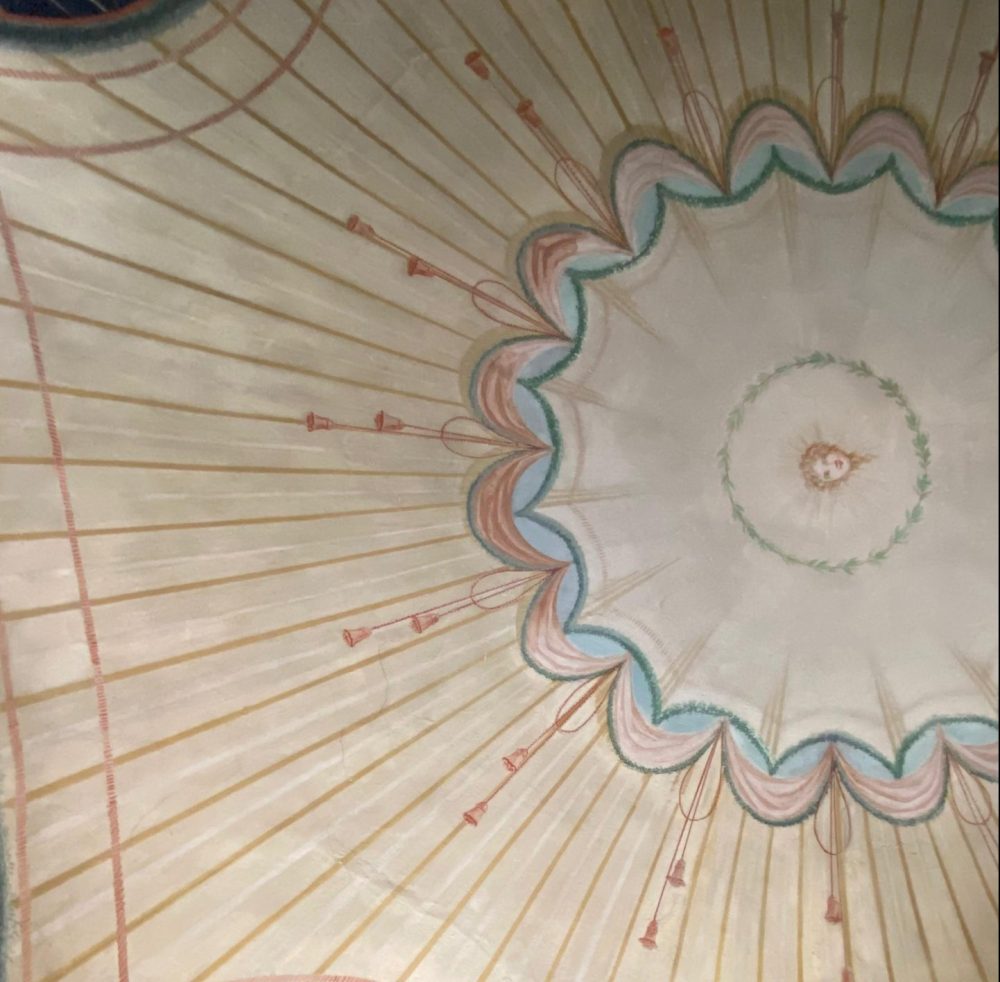 La decorazione ottocentesca della volta è successiva rispetto a quella delle sale precedenti e, per tecnica pittorica e materia, risulta contemporanea alla decorazione della Cappella. Della fase decorativa settecentesca rimangono, in questa sala, la zoccolatura e le cornici alle finestre. Anche in questo ambiente, come in quelli accanto, le pareti erano rivestite con tappezzerie in carta dipinta a mano.