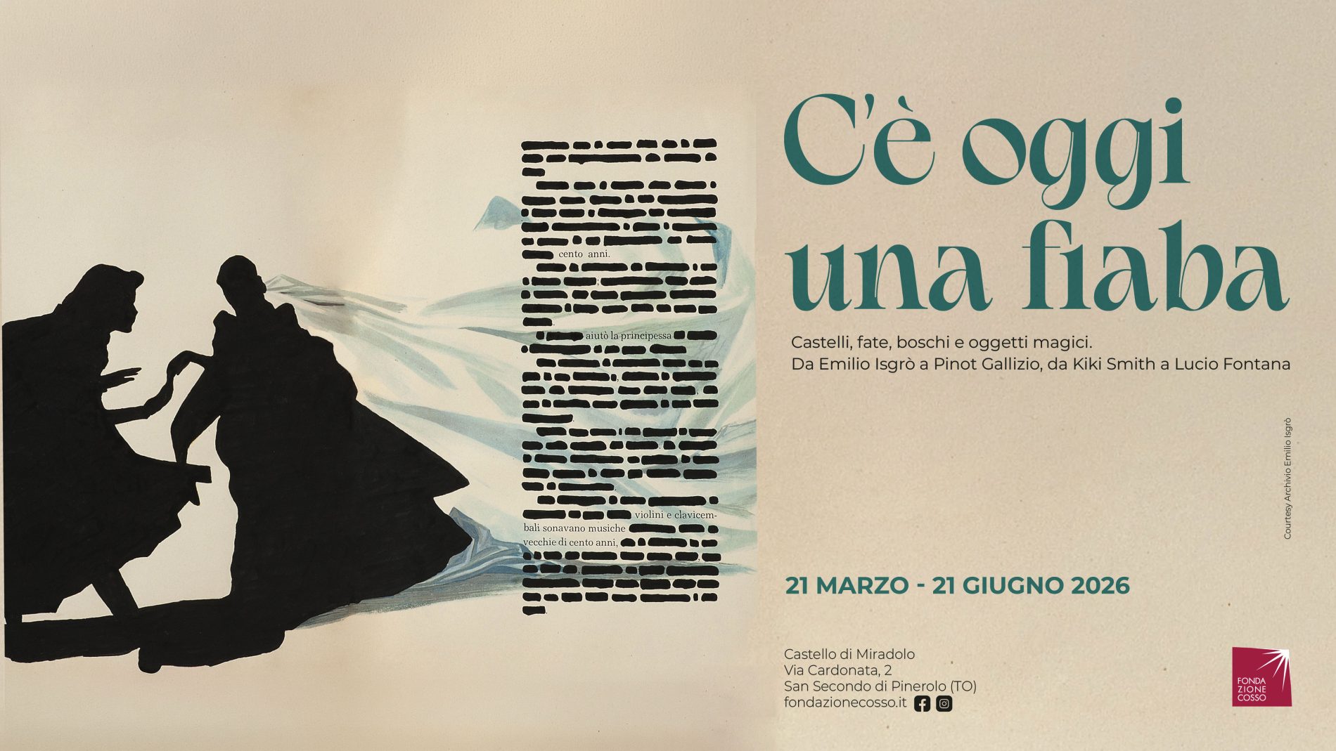 C’è oggi una fiaba è una mostra costruita come un racconto corale in cui la fiaba classica prende forma attraverso le opere di alcuni tra i protagonisti dell’arte moderna e contemporanea. Da Osvaldo Licini a Fausto Melotti, da Lucio Fontana a Michelangelo Pistoletto, da Piero Gilardi a Yves Klein, fino a Carol Rama, Aldo Mondino, Emilio Isgrò, Luigi Mainolfi, Emanuele Luzzati, Joseph Kosuth, Kiki Smith, Grazia Toderi, Pinot Gallizio, Luigi Veronesi, Joseph Beuys, Sofia Cacherano di Bricherasio e Giuseppe Pietro Bagetti, il percorso intreccia linguaggi, epoche e sensibilità differenti per restituire la fiaba non solo come genere letterario o illustrativo ma come struttura del pensiero visivo. Le opere, che provengono da istituzioni torinesi (GAM – Galleria Civica d’Arte Moderna e Contemporanea, Museo della Frutta, Musei Reali – Museo di Antichità, Teatro Regio), da importanti collezioni private, fondazioni e gallerie internazionali, non illustrano storie, ne assumono i meccanismi profondi – lo specchio, il bosco, l’oggetto magico, la scarpetta, la metamorfosi, il lieto fine – trasformando il Castello di Miradolo in uno spazio intimo e insieme collettivo.